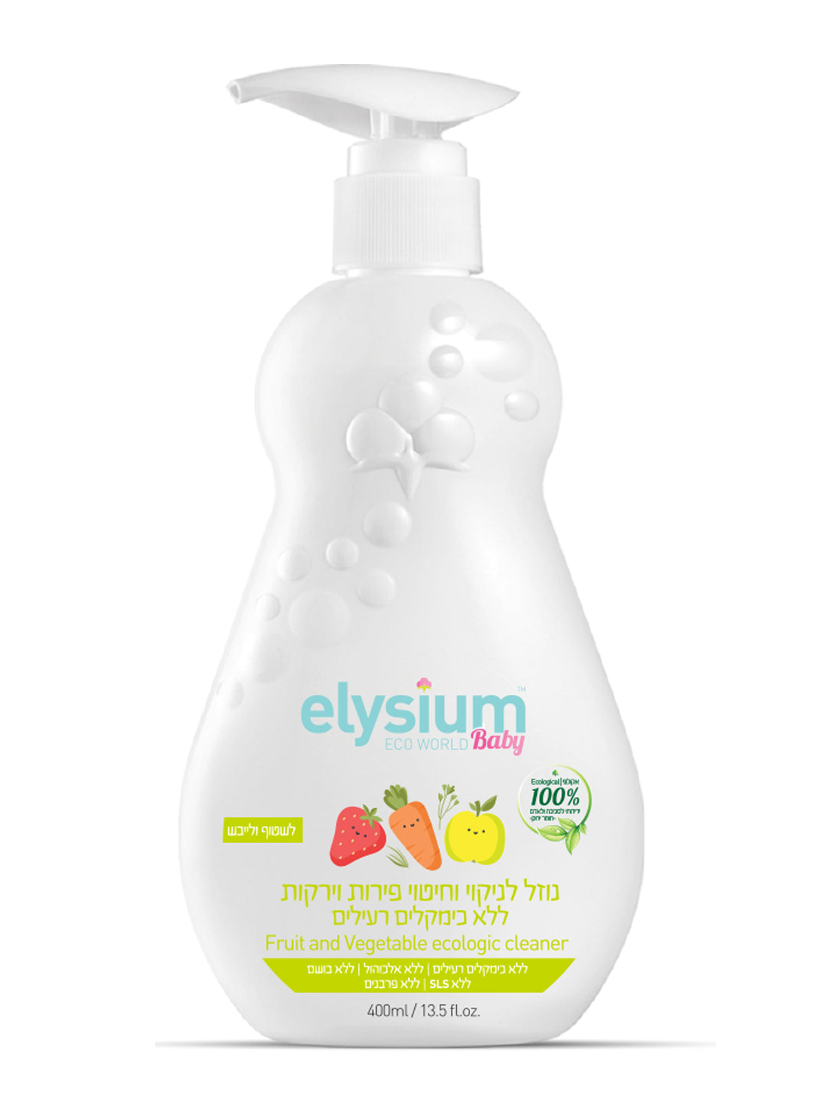 וזל אקולוגי אנטי בקטריאלי על בסיס מים. נוזל זה מיועד לשטיפה, ניקוי וחיטוי של פירות וירקות, ידידותי למשתמש ולסביבת ילדים ותינוקות. המוצר משאיר את הפירות והירקות נקיים וטריים ללא טעמי לוואי. אליסיום נוזל לשטיפה ניקוי וחיטוי פירות וירקות אינו מכיל חומרים רעילים ומתפרק באופן טבעי, הנוזל הינו אחד מהמוצרים האקולוגיים בסדרת המוצרים של אליסיום שמטרתם לשמור על איכות הסביבה כסביבה נקייה מרעלים ולתת בטחון בעת השימוש במוצרי תינוקות וילדים. אליסיום עומד בתקן- REDILY BIODEGRADABLE- תקן המגן על בריאות האדם ואיכות הסביבה.