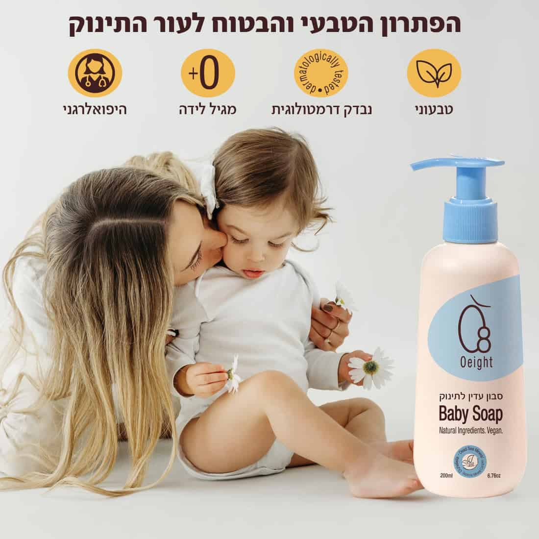 סבון הרחצה העדין של או אייט הוא הבחירה המושלמת לרחצה יומיומית של התינוק וכל המשפחה. פורמולה טבעية 100% עם רכיבי ניקוי רכים במיוחד, שמנקה ביסודיות מבלי לייבש או לגרות את העור הרגיש. מתאים מגיל לידה והלאה.